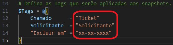 2 - O arquivo ‘snapshot.ps1‘ encontra-se devidamente preenchido contendo as informações necessárias para a criação das TAGs como: