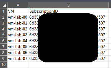1 - Abra o arquivo ‘snapshot.csv‘ e substitua as colunas A e B a partir da linha 2. Onde na coluna A representam as VMs que serão realizadas os snapshots e na coluna B ficará o ID da Subscription (assinatura) onde estão alocadas as VMs: