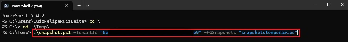 1 - Navegue até a pasta ‘C:\Temp' e execute o snapshot.ps1 incluindo os parâmetros -TenantId “xxxxxxxx-xxxx-xxxx-xxxx-xxxxxxxxxxxx” -ResourceGroupName “nomedoRG”.