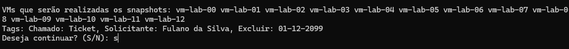 Basta incluir um S para continuar e aguardar a execução do script completo e aparecerão as informações relevantes sobre cada snapshot realizado automaticamente: