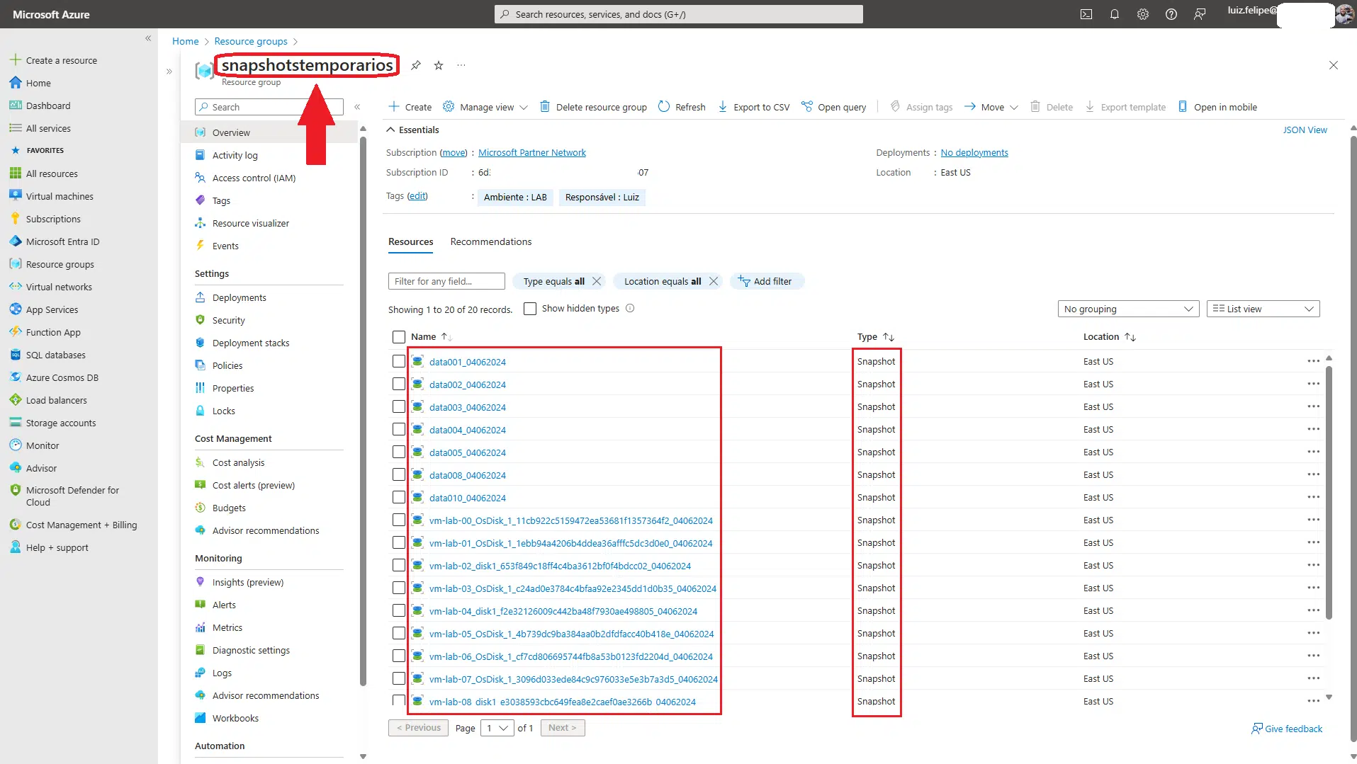 Vamos olhar agora no Portal do Azure para validar se todos os snapshots (no caso eu selecionei todos os discos) foram realizados com sucesso: