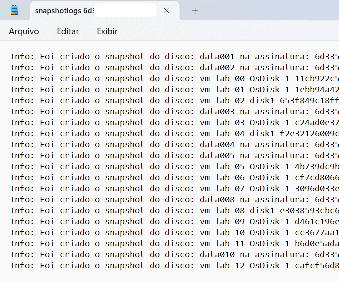 Adicionalmente foi criado um arquivo de LOG contendo as informações dos discos que foram realizados os snapshots e armazenado na mesma pasta onde está localizado os arquivos: